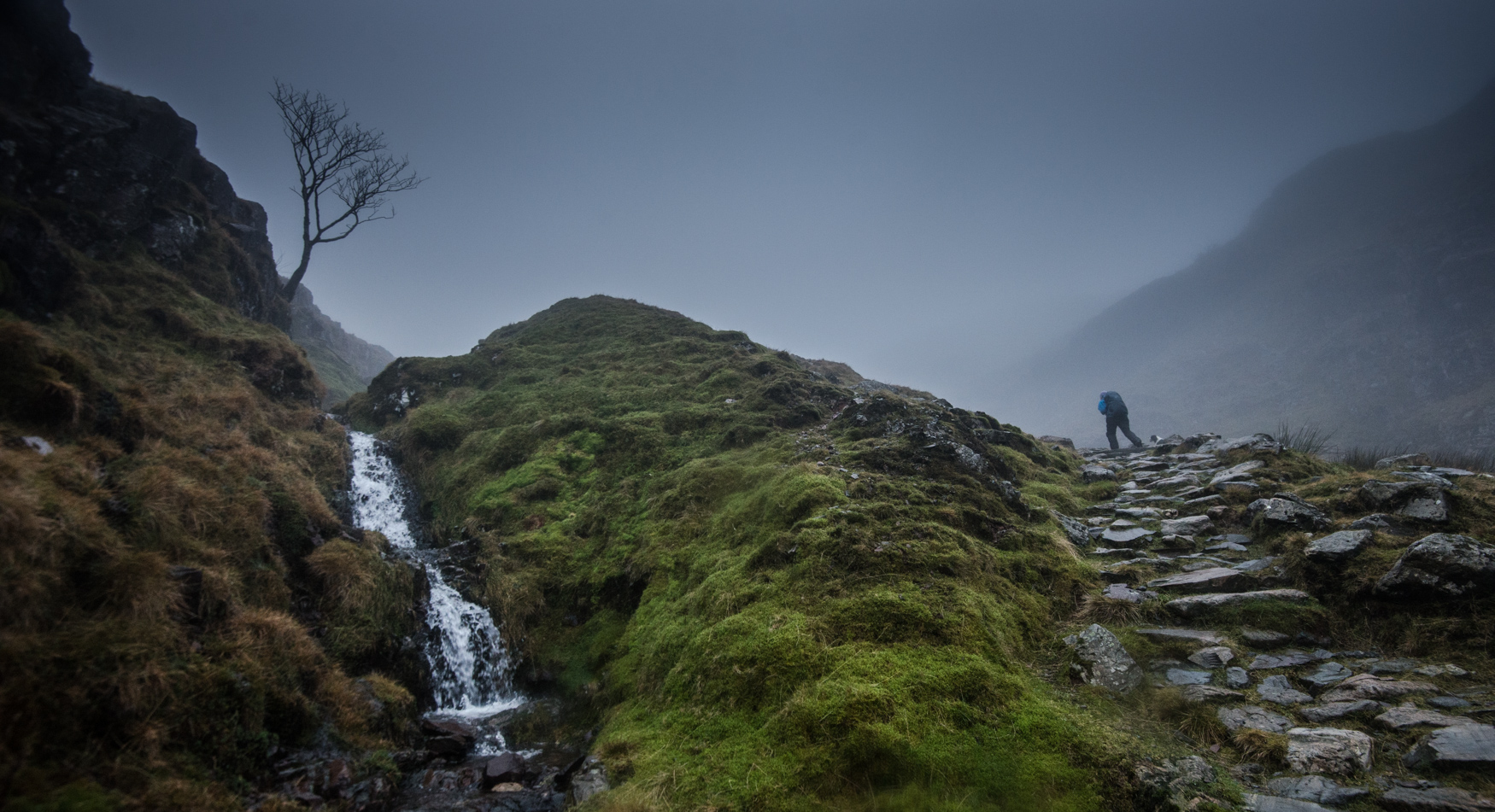 The chill of winter is held fast up here, even though the valley below is mimicking an early spring, with an air temperature of ten degrees. Up here, the wind is racing and pushing wisps of cloud across the near-vertical rock face of Great End. This is where you feel the bite on your fingers and the creeping cold of damp shoulders and feet, where the elements have pressed in; and when you stop moving your core temperature quickly drops. We move on, and take ourselves out of the wind, and downhill. The view opens up and we become warm again, arriving back in Seathwaite four hours after we started, ready to head up Blencathra to place the next sensor.