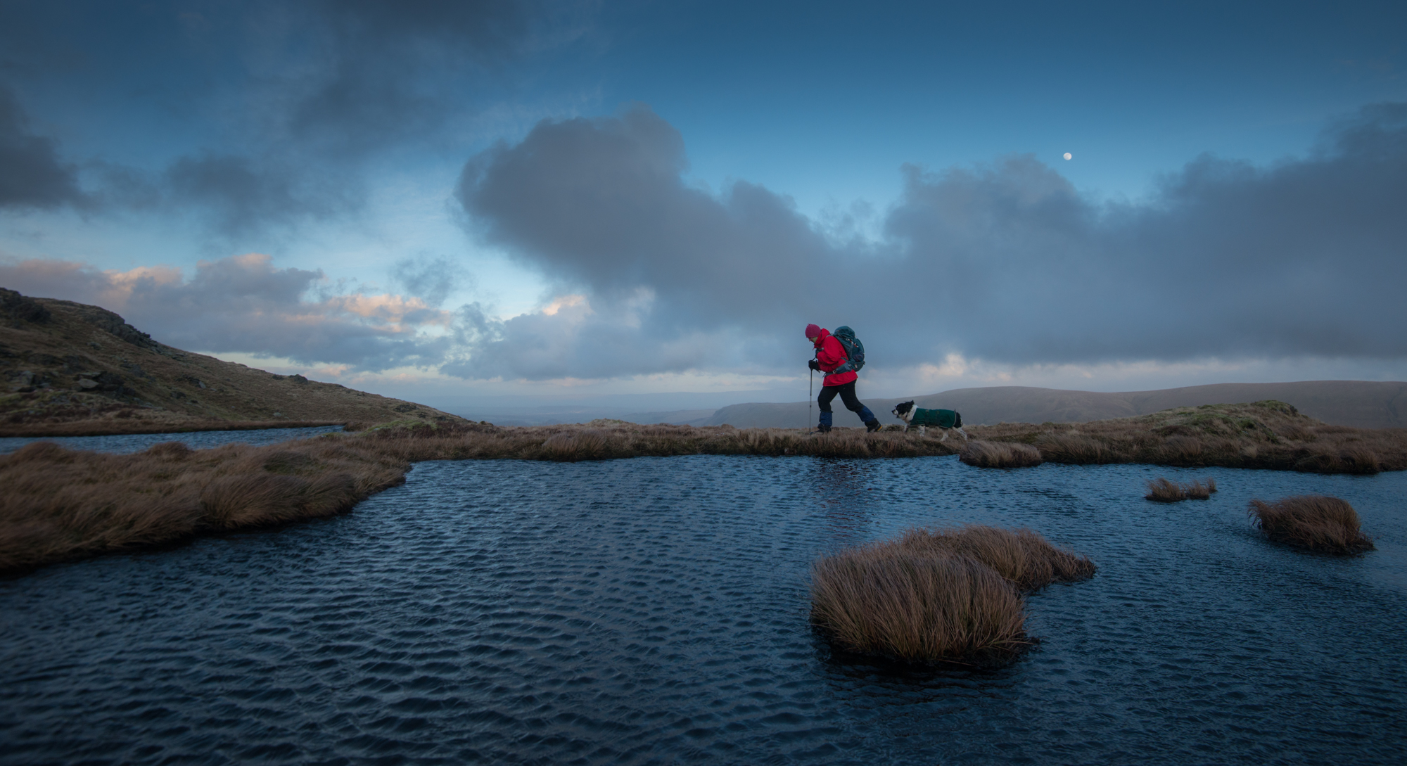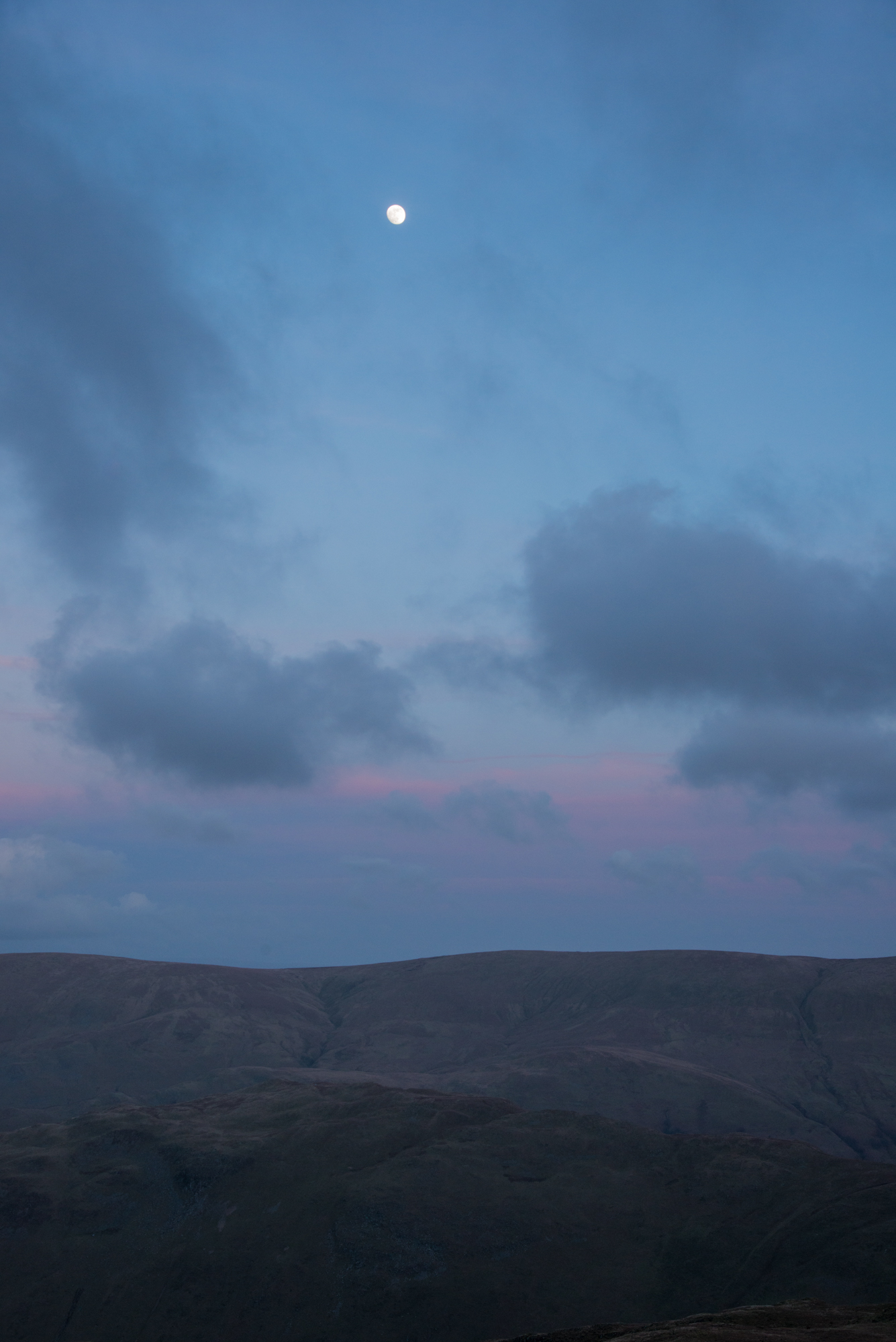 The wind on the small tarns up here is making oceans of them, water blackened then silvered, and thrown to the air. Rob has been photographing, and returns, his mouth full of wind and racing clouds, eyes carrying the day’s last fire. Together we rest a while longer and watch the deepening blue, the moon becoming brighter and brighter, craters smudged across its pearl face. But the wind is insistent, and hurls icy blasts at us. We become cold, and decide to head down, and into the coming of dark.