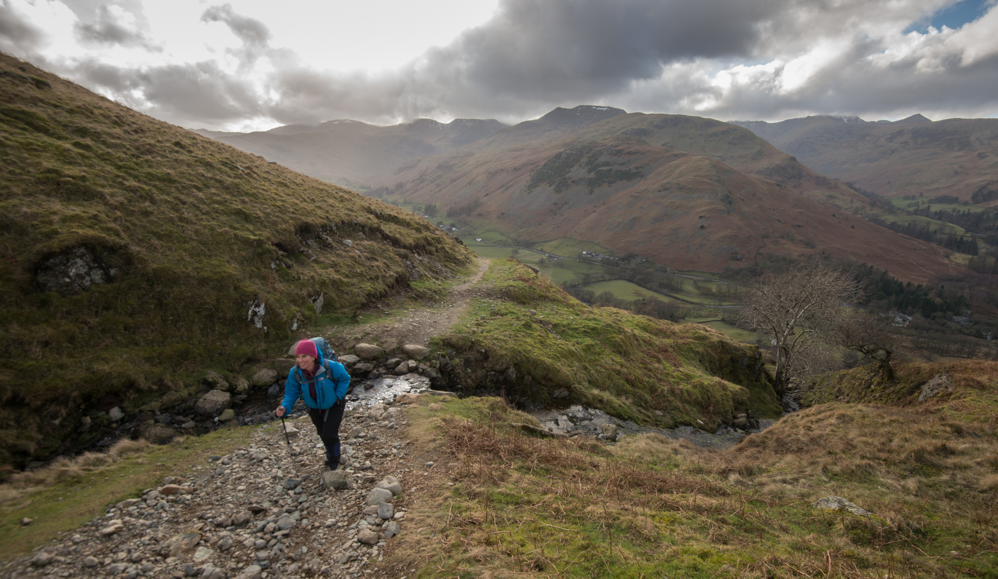 This wintering land presents itself in the skeletal shapes of trees and light that comes and goes with the skudding clouds. The wind is a roar through the leafless oaks. The sun is warm, though, and I heat up quickly once we start walking up hill, a gradual ascent on a balcony path from Hartsop towards Boredale Hause.