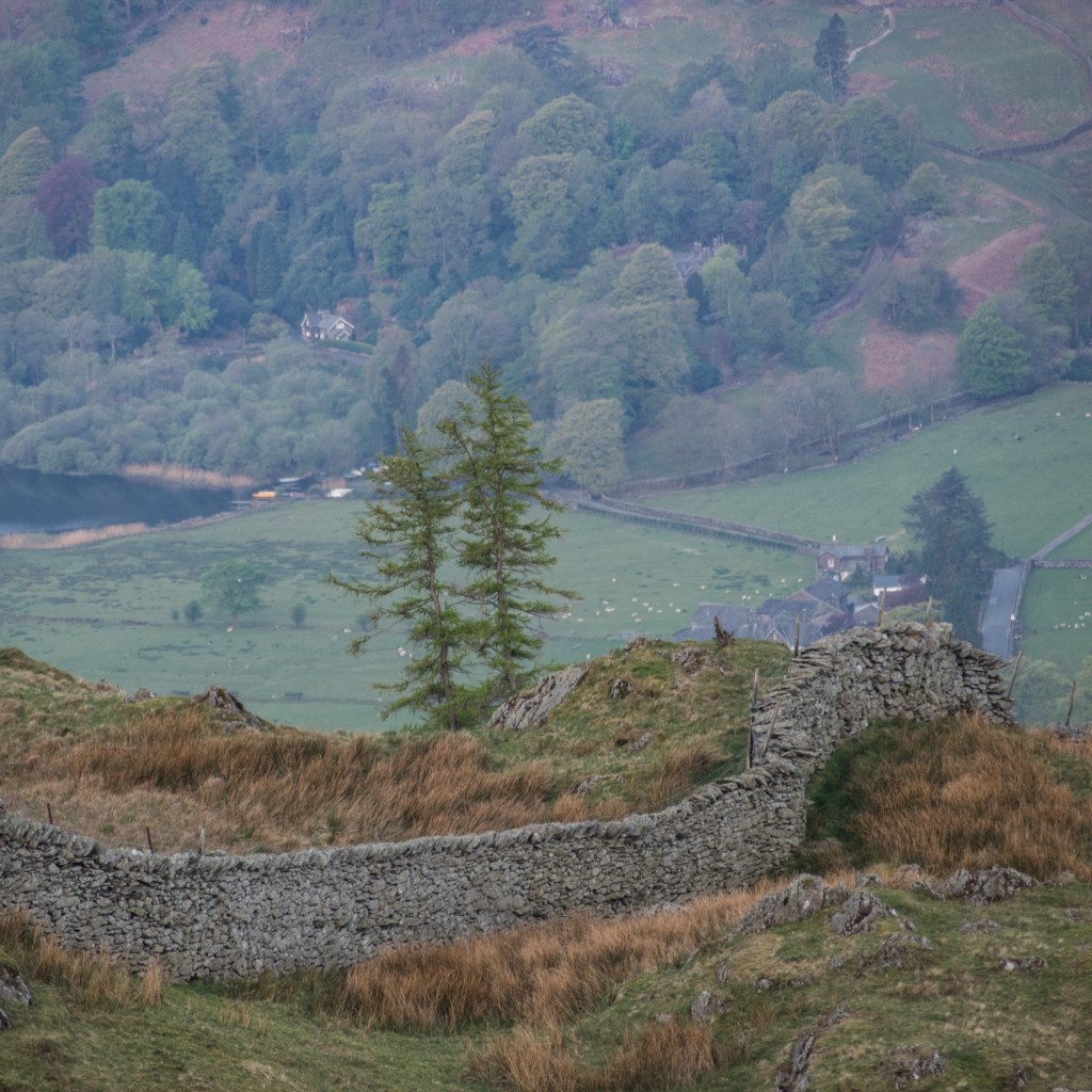 Looking down over Grasmere, the valley embraces deciduous woodland, green fields, neat walls and a scattering of houses. None of this is by chance: efforts to keep the valley ‘picturesque’ have been going on ever since Wordsworth’s time. One of the things I hadn’t noticed until it was pointed out to me is the absence of overhead wires and pylons – all the electricity here (as is the case in several Lake District valleys) is fed along wires that are underground.