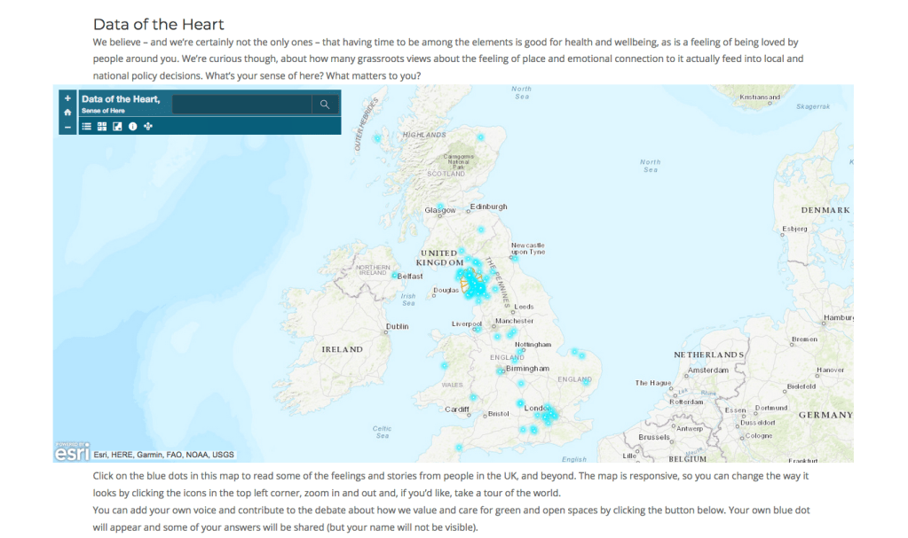 The survey that has been feeding into the Data of the Heart map includes questions about hope – and this is perhaps the crux of the matter. What we hope for, and the actions we take or ask for, begin to pave the path for change. In architecture there’s a phrase that’s commonly used to describe what can influence designs: ‘desire lines’ refers to the way the design of a park, a garden or any outdoor space is allowed to reflect what people want. You observe how people choose to walk from place to place, and then build the footpaths to accommodate this. It’s a neat example of how what people want can actually shape what they get. So how might desire and hope shape the future of places where nature has breathing space, places that offer a natural health service for humans, and also offer habitats to many other species?