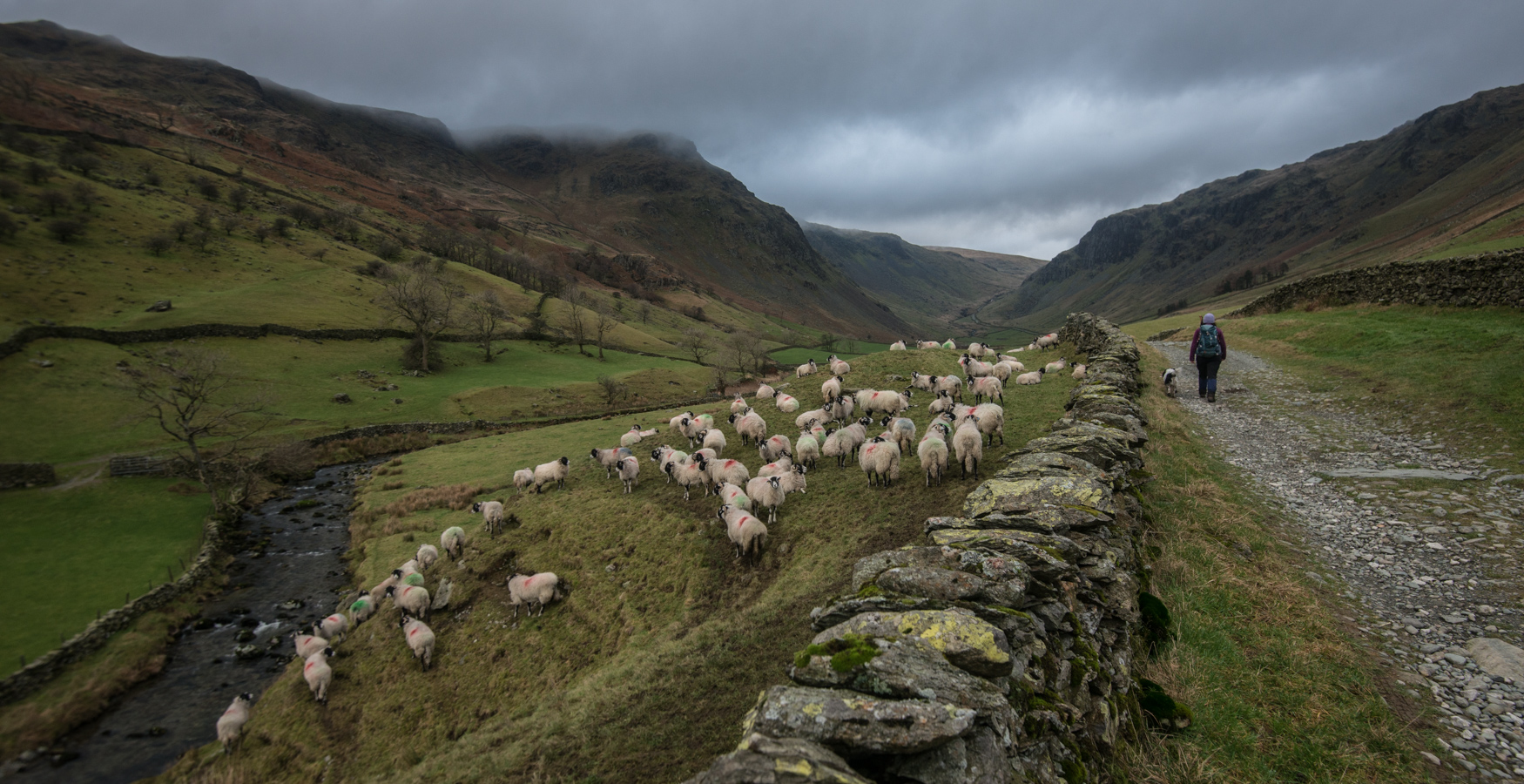 Heading from Sadgill up Gatesgarth Pass we’re following a walled-in track that once was trodden by people walking their flocks and their produce to Haweswater, and beyond to Shap and Penrith.