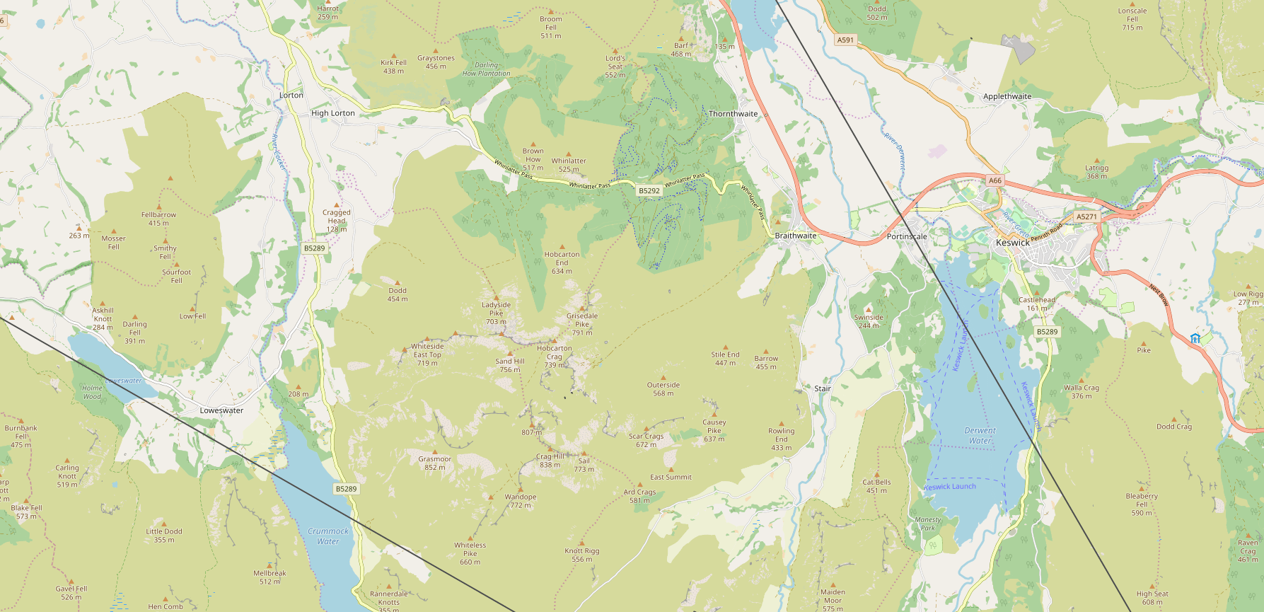 This segment of land widens out from Grasmere with the rise of land over Dunmail Raise, reportedly holding the remains of King Dunmail, the legendary last king of Cumberland, and the Thirlmere Valley: the reservoir was created here by extending a natural lake, which meant flooding the villages of Amboth and Wythburn, at the end of the nineteenth century. The valley sides are heavily wooded, hemmed in by the Dodds which rise in the east, and Amboth fell to the west. The main road through the central lakes, the A591, runs alongside Thirlmere to link Grasmere and Keswick, passing by St John’s in the Vale, and Castlerigg – the most famous of Cumbria’s many stone circles. Keswick, the largest town in the north lakes and a hub for climbers and hill walkers, sits at the northern end of Derwent Water, under the watchful eyes of Skiddaw. To the northwest of Keswick, Blencathra looms above the main A66 trunk road; this fell seems to have several pleats, like a spread-out skirt, and never catches the light in the same way twice. To the north of Skiddaw and Blencathra, the rolling land is relatively unexplored by tourists; quiet areas slope towards lower land and the Solway Firth, where shifting tides make perfect habitat for wading birds, and Hadrian’s Wall comes to its westernmost point.